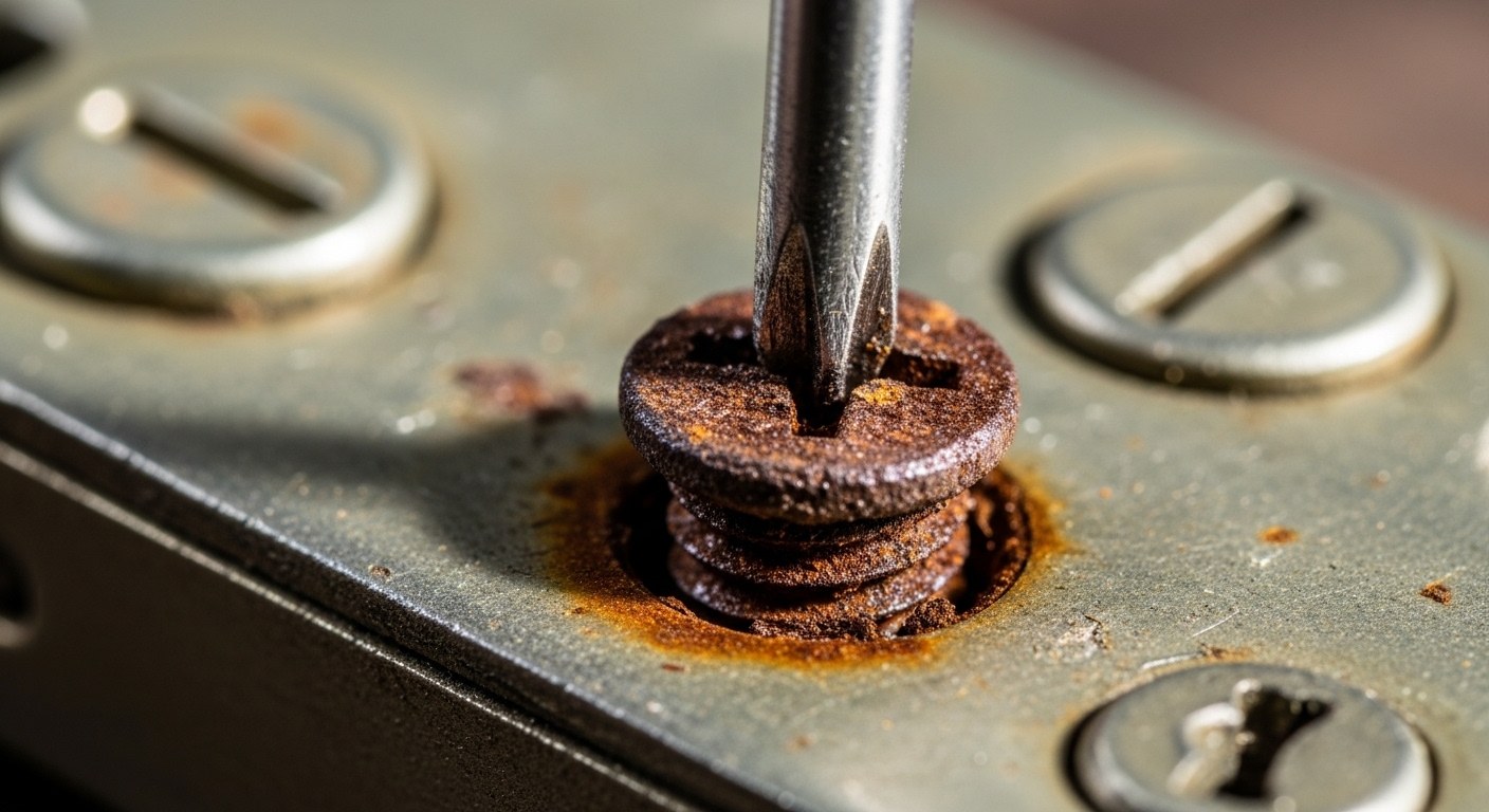 いざ交換しようとしたら「ネジが錆びて回らない!」というトラブルは現場でもよくあります。特に玄関は雨風にさらされるため、内部で腐食が進んでいることが多いのです。